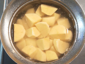 ![]() 2:鍋にじゃがいもとひたひたの水を入れて火にかけ、沸騰したら、中火にして、10分ほどゆでましょう。 (竹串がすっと通るくらいまで) |