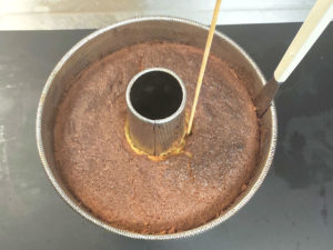 10:ケーキが焼けたら、すぐに逆さにして、瓶などに挿し、このまま1時間以上放置しましょう。