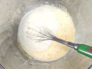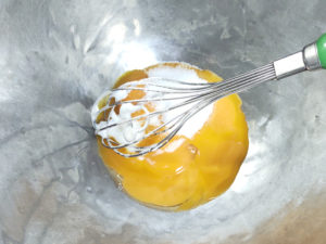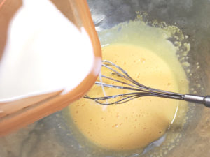 4:卵黄のボールに牛乳を少しずつ加え、その都度よく混ぜます。