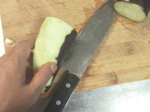 ![]() 1:なすは、皮が硬い場合は、皮をむいておきます。 |