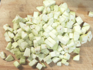 ![]() 3:なすは小さめの角切りにします。 |