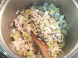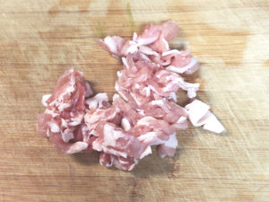 ![]() 4:豚こまは小さめに刻み、粗みじんに切っておきましょう。 |