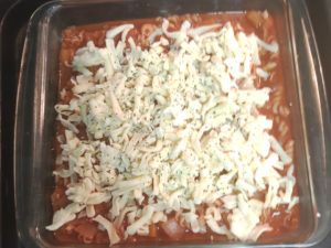 ![]() 9:グラタン皿(今回は20cm角のケーキ型を使いました)などに、中身を全てあけ、上にたっぷりのチーズを散らし、お好みで乾燥パセリをふります。 |