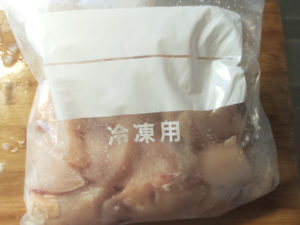 ![]() 2:大きめのZIPロックの袋などに、切った鶏肉、塩、酒を入れ、袋の上からもみこみましょう。 |