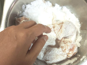 ![]() 5:鶏肉に片栗粉を薄くまぶします。 |