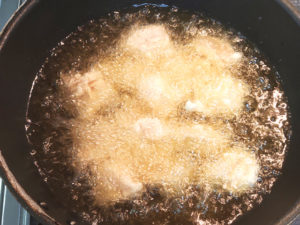 ![]() 6:180~190度の油で、鶏肉の表面がやや茶色になるまで揚げましょう。 |