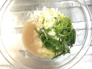 ![]() 10:調味料が溶けたら、ボールにネギのみじん切りを加えて混ぜ、再度レンジで1分ほど加熱します。 (我が家は生のネギが苦手な人が多いので、軽く火を通しました。) |
