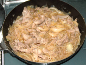 3:フライパンに、玉ねぎ、豚肉、白滝、★調味料を全て加えて、全体を良く混ぜます。