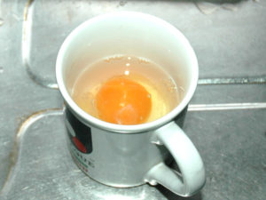 7:マグカップに6分目まで水を入れ、卵を1個落とします。