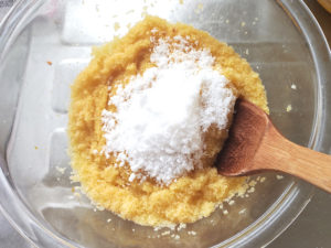![]() 13:生地を蒸らしたら、上白糖と塩を加え、良く混ぜあわせます。 |