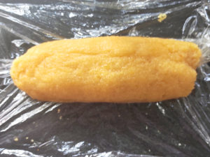 ![]() 14:ラップを敷いた台の上に乗せ、生地を棒状にまとめ、8等分しましょう。 |