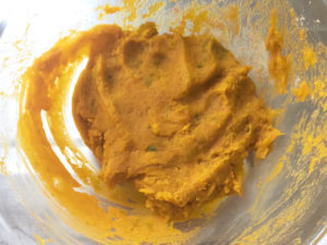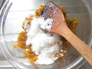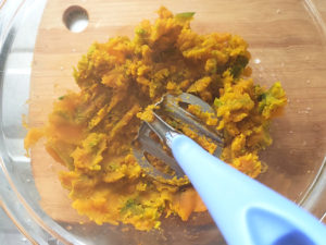 ![]() 3:かぼちゃが熱いうちに、マッシャーで細かくつぶします。 |