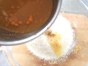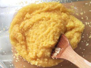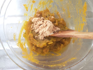 ![]() 8:ボールに水を入れて、かぼちゃパウダーを溶かしましょう。 (ダマが残っていても大丈夫です。) 9:耐熱ボールに道明寺粉を入れ、南瓜入りの水を少しずつ加えて、その都度よく混ぜます。 |