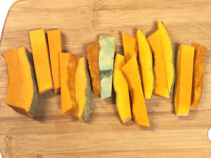 ![]() 1:かぼちゃは種とワタを取り、1cm厚さのスティック状に切ります。 (揚げるので、皮つきでもOKです。) |