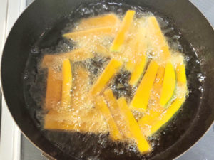 ![]() 2:180度の油で、南瓜を3~4分素揚げしましょう。 |