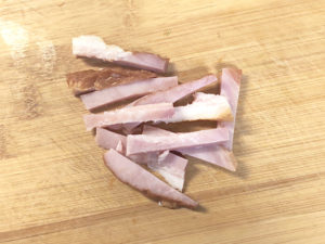 ![]() 3:ベーコンは食べやすい大きさで、できればスティック状に切ります。 (スライスベーコンなら、細切りでもOKです。) |