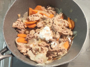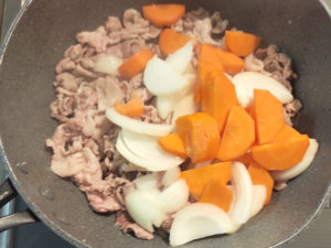 ![]() 4:テフロン加工のフライパンに油をひかずに豚こまを炒め、肉が白くなったら、玉ねぎと人参を投入し、全体に油が回るまで炒めましょう。 |