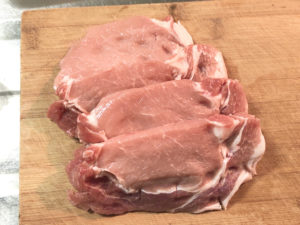 ![]() 1:豚肉は、身と脂身の間に垂直に切り込みを入れます。 (筋きりすると、焼いても縮みにくくなります。) |