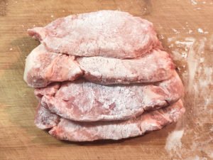 ![]() 2:豚肉に薄くまんべんなく、片栗粉をまぶしましょう。 |