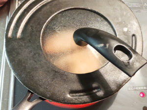 ![]() 5:焼き色が付いたら、蓋をして、弱火で3分蒸し焼きにします。 |