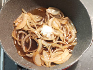 ![]() 8:フライパンに、砂糖、おいしい便利酢、みりん、醤油を加え、まず玉ねぎに味を絡めます。 |