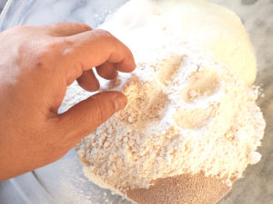 2:ぬるめの水を3回に分けて加え、生地がまとまるまで捏ねましょう。