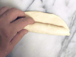 11:楕円形の生地を今度はクルクルと丸めて棒状にしましょう。
