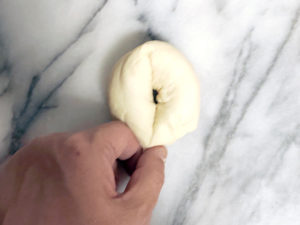 7:生地を12等分したら、1個を手に取り、伸ばしてたたむを数回繰り返したら、閉じ目を下にして、台の上で転がすようにして丸めます。