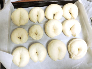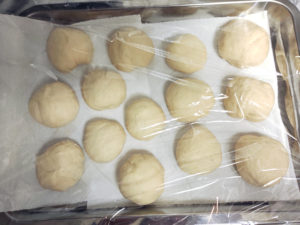 14:天板にクッキングシートを敷き、上に少し間隔をあけて並べ、ラップをして、再度35度で40分ほど発酵させます。