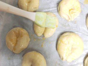 16:生地が乾かないように、溶き卵を表面に刷毛で塗りましょう。