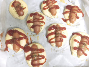 ちょっと生地からソーセージが浮いちゃいましたが、割と強めに生地に押し込んだ方が見た目も良くなると思います。