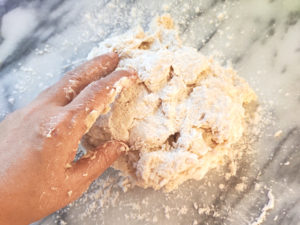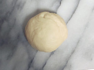 3:生地が大体まとまったら、強力粉で打ち粉(分量外)をし、台の上に生地を乗せたら、上からも打ち粉(分量外)をして、3分ほど捏ねます。