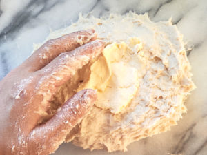 4:生地でマーガリンを包むようにして、再度捏ね、10分くらい捏ねて、表面が滑らかになったらOK。