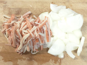 ![]() 1:玉ねぎは皮をむき、薄くスライスし、かにかまは、手で細かくほぐしておきます。 |