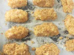 ![]() 14:天板にオーブンシートを敷き、衣をつけたコロッケを並べます。 |