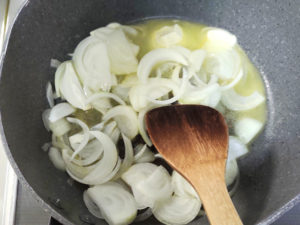 ![]() 2:フライパンにマーガリンを引いて、弱火で、玉ねぎを炒めましょう。 3:玉ねぎが半透明になったら、火を一旦止め、タネ用薄力粉を加え、全体がなじむまで、しっかりと混ぜます。 |