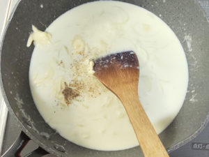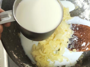![]() 4:再び火をつけ、弱火にしてから、牛乳を少しずつ加えていきましょう。 |