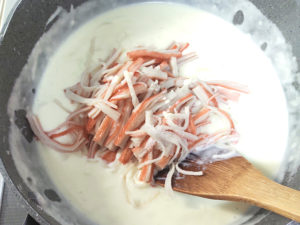 ![]() 5:マヨネーズと塩、黒コショウも加え、全体がもったりとするまで火を通します。 |