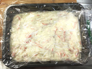 ![]() 8:バットなどに平らに詰め、粗熱が取れたら、ラップをして、冷凍庫で30分以上冷やします。 (必ず、30分以上は冷やさないと、整形がしづらくなるので、できれば冷凍庫に入れてください。) |