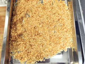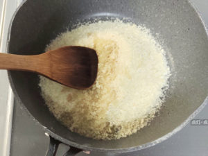 ![]() 9:フライパンにパン粉と油を入れて混ぜながら、茶色く色づくまで弱火で炒めましょう。 |