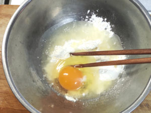 ![]() 11:ボールに衣用薄力粉、卵、水を入れて混ぜ、バッター液を作っておきましょう。 |