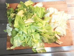 ![]() 4:キャベツは芯を落としざく切りにしましょう。 |
