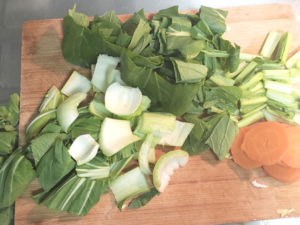 ![]() 5:小松菜とチンゲン菜はそれぞれ根元を落とし、こちらもざく切りに、人参は皮をむいて薄切りにします。 |