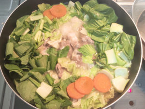 豚パイカが安く手に入ったので、余りもの野菜と一緒に鍋にしてみました。出汁が美味しいと好評で、豚パイカも少し食べやすくなったと思います。