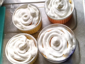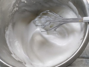 1:卵白に砂糖をひとつまみ加えて泡立て始め、クリームくらいの硬さになったら、残りの砂糖を二回に分けて加え、ピンと角が立つまで泡立てましょう。