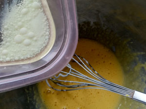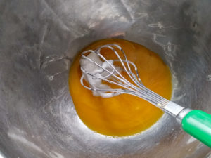 3:牛乳とサラダ油を一緒にレンジで10秒ほど温め、卵黄のボールに少量ずつ加え、その都度良く混ぜ合わせましょう。