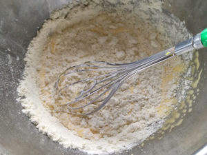 4:卵黄のボールに粉を全量ふるいながら加え、粉っぽさがなくなるまで混ぜましょう。