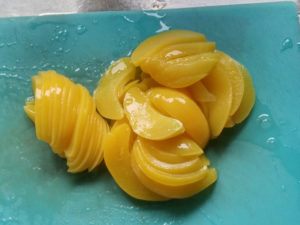 8:デコレーションの黄桃は薄くスライスしましょう。