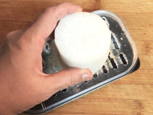 ![]() 4:大根は皮をむき、おろし金ですりおろしましょう。 (水分を切りたい場合は、ザルでこしてください。) |