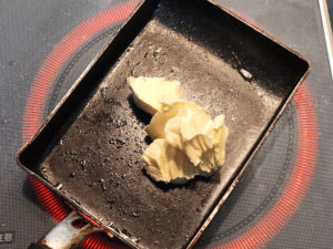 ![]() 5:フライパンに有塩マーガリンを入れて火にかけ、完全に溶かします。 |